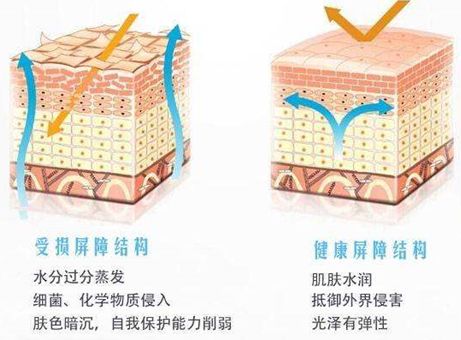 皮肤角质层变薄,局部角质层细胞层数相对减少,直接表现为表皮变薄;而皮肤功能改变主要由于皮脂膜破坏,结合其他因素导致的屏障功能减弱,从而使水分容易透过,导致跨表皮水分丢失升高——皮肤的反应性升高。