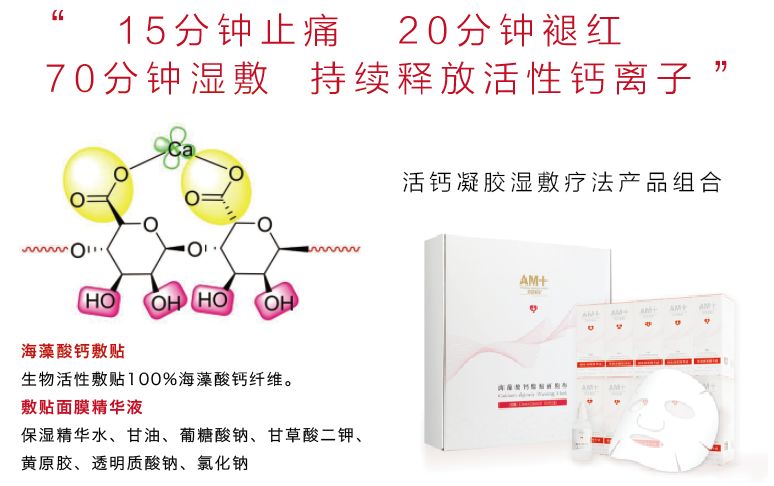 凝胶内钙-钠置换反应继续进行,游离的Ca2+、甘草酸盐渗透到肌肤。舒敏抗炎,褪红消肿,加快上皮细胞迁移,促进创面愈合修复。